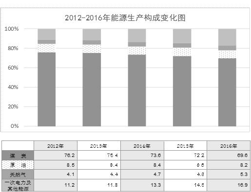 在一次能源生产构成中,2016年原煤占69.6%,比2012年下降6.6个百分点;原油占8.2%,下降0.3个百分点;天然气占5.3%,提高1.2个百分点;一次电力及其他能源占16.9%,提高5.7个百分点。煤炭生产比重的持续降低和清洁能源比重的不断提高,表明我国能源生产结构正朝着多元化的目标快速前进。