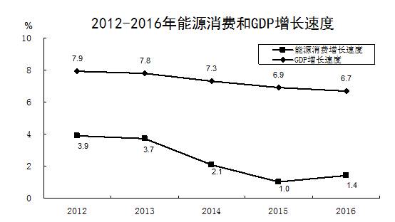 2016年,全国能源消费总量为43.6亿吨标准煤,比2012年增长8.4%,年均增幅为2.0%,比2005年至2012年的年均增幅低4.3个百分点,其中,煤炭消费自2013年之后连续三年下降,从2013年的42.4亿吨降至2016年的37.9亿吨,分别比上年下降3.0%、3.5%和4.7%。2016年,石油消费约5.7亿吨,比2012年增长19.3%;天然气消费2086亿立方米,增长39.3%;全社会用电5.9万亿千瓦时,增长19.4%。
