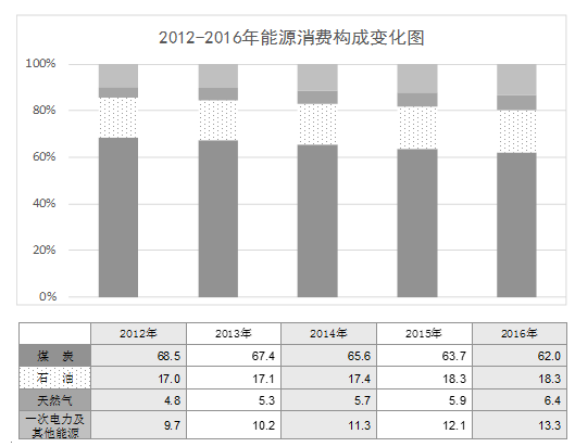 从能源消费构成来看,2016年煤炭消费占62.0%,比2012年下降6.5个百分点;石油消费占18.3%,提高1.3个百分点;天然气消费占6.4%,提高1.6个百分点;一次电力及其他能源消费占13.3%,提高3.6个百分点;清洁能源消费比重为19.7%,提高5.2个百分点。